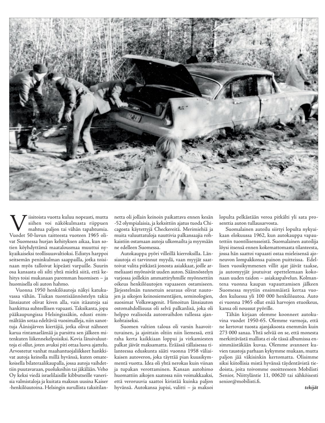 Astu aikamatkalle suomalaisen autoilun kultakaudelle! Mobilisti Seniorin ensimmäinen erikoisalbumi kokoaa yhteen satoja ainutlaatuisia autokuvia ajalta, jolloin Suomi siirtyi säännöstelyn vuosista vapaan autokaupan aikaan.