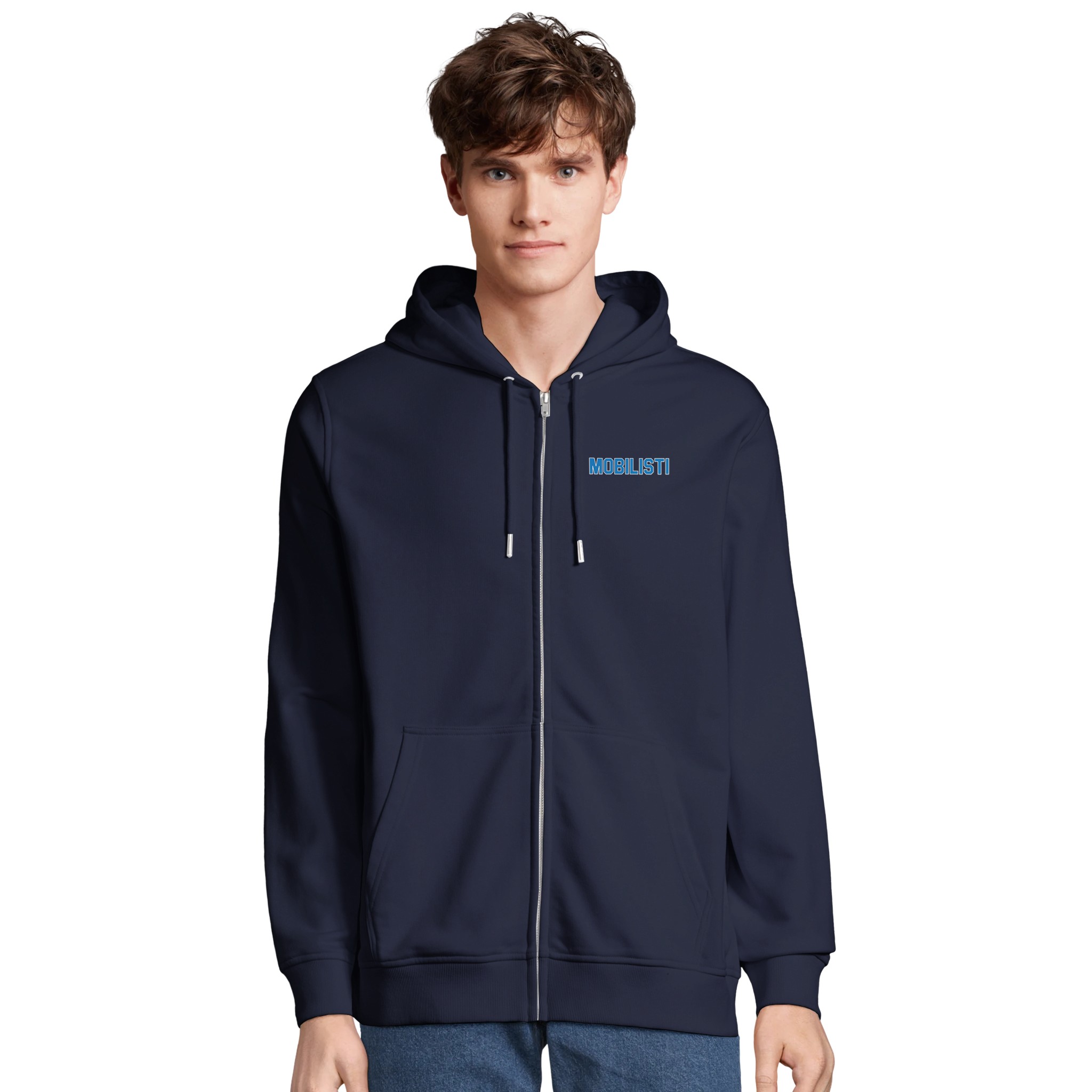 Tyylikäs Mobilisti-logo rinnassa ja selässä. Vetoketju ylös asti – suojaa viimalta ja näyttää hyvältä.